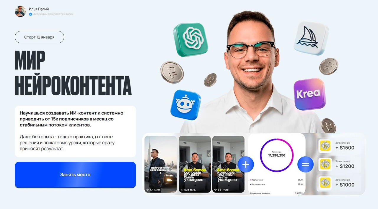 Научишься создавать ИИ-контент и системно приводить от 15к подписчиков в месяц со стабильным потоком клиентов.